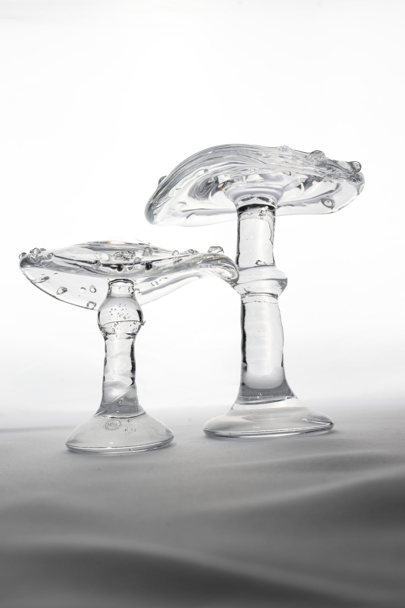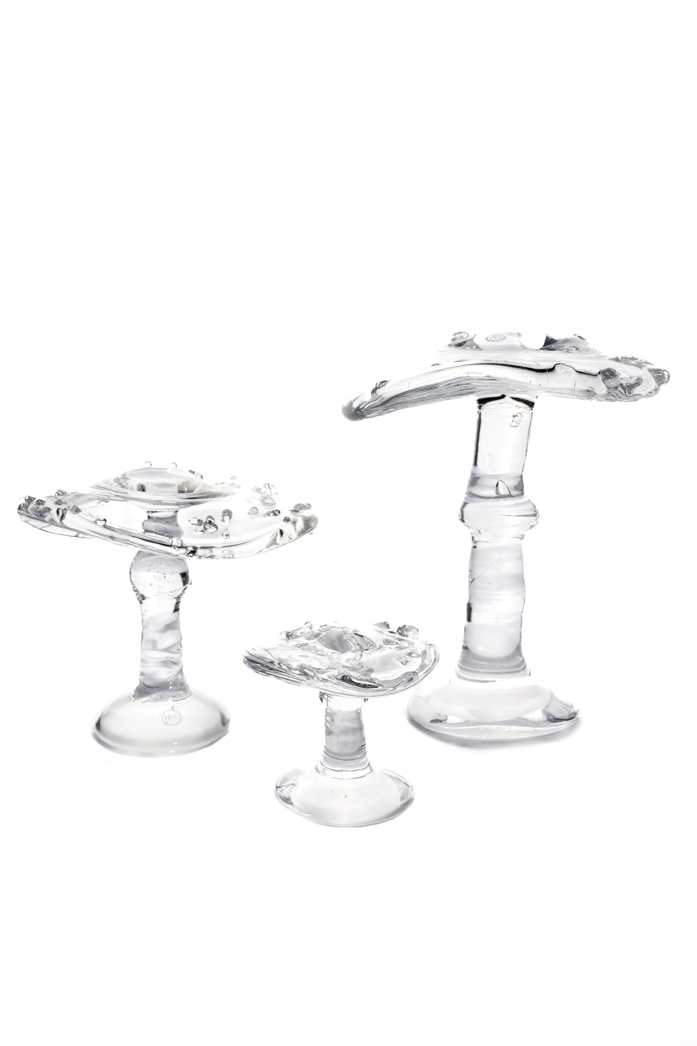 Handskulpterade svampar med naturligt och personligt uttryck i klarglas. Vi parar ihop tre fina i lite olika höjd som passar fint ihop.